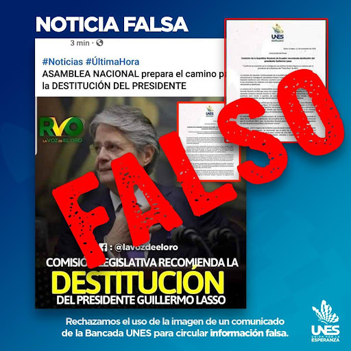 En primer lugar, se confunde comisión legislativa —un órgano oficial de la Asamblea— con una bancada, que es un conglomerado político de asambleístas—. En segundo lugar, sugiere que es la bancada correísta, aglutinada en UNES, la que pide la supuesta destitución. Sin embargo, en la cuenta oficial de UNES, en Twitter, mencionan que esa bancada no ha emitido ningún comunicado en busca de la destitución del Presidente. Además, mencionan que rechazan el mal uso a su imagen.