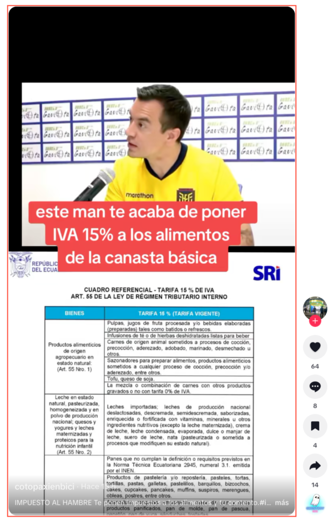 En publicaciones que circulan en redes se afirma que Noboa “acaba de poner IVA 15% a los alimentos de la canasta básica”. Esa frase induce al error por dos motivos. Primero, porque presenta la circular como si hubiera creado un impuesto nuevo o eliminado por sí sola una exención legal. Esto se puede ver en publicaciones como la siguiente: