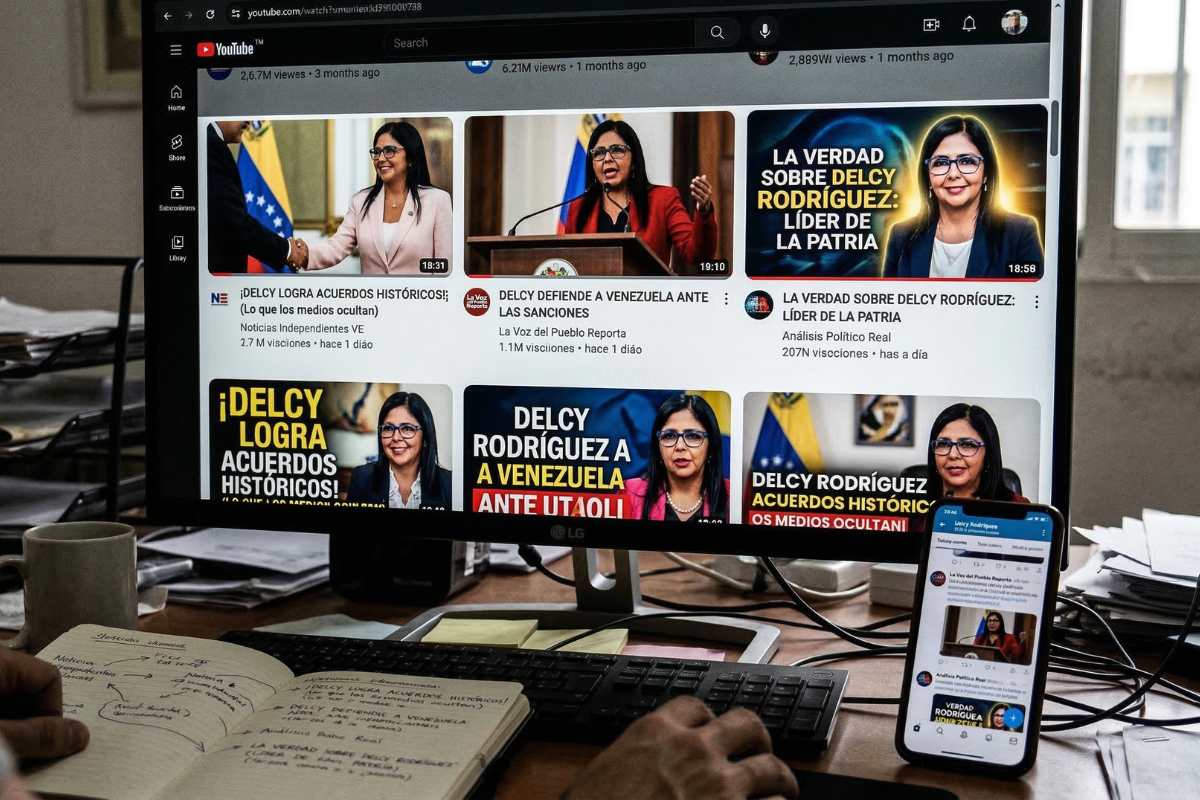 Una investigación de Cazadores de Fake News documentó una operación coordinada en YouTube que usa canales con apariencia de medios de comunicación para difundir videos favorables a Delcy Rodríguez entre audiencias venezolanas. El caso importa públicamente porque muestra una forma más sofisticada de propaganda digital: no se presenta como propaganda abierta, sino como si fuera cobertura periodística, apoyada además con publicidad pagada para maximizar su alcance.