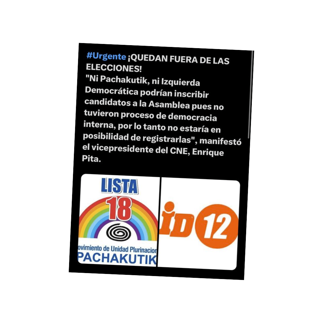 Una publicación en Facebook asegura que la Izquierda Democrática y Pachakutik se quedaron fuera de las elecciones, asegurando que los movimientos no están habilitados para inscribir candidaturas por la falta de procesos de democracia interna.