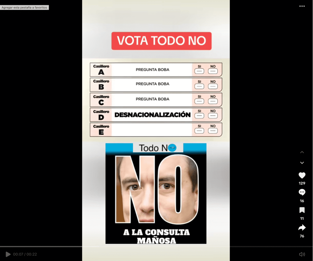 FALSO. El video fue publicado en abril de 2024, en el marco de la consulta popular de ese año. Las preguntas sobre desnacionalización y explotación laboral pertenecen al proceso electoral de 2024, ya concluido, y no están incluidas en la consulta convocada para noviembre de 2025. Este tipo de contenidos puede generar confusión en el electorado y distorsionar el debate público previo a la jornada electoral.