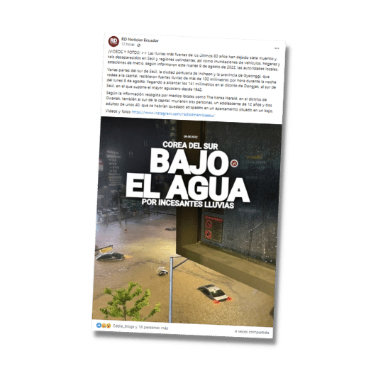 En Facebook circula una imagen que asegura que Corea del Sur está bajo el agua por incesantes lluvias. Esta información es cierta, varios medios lo han confirmado.