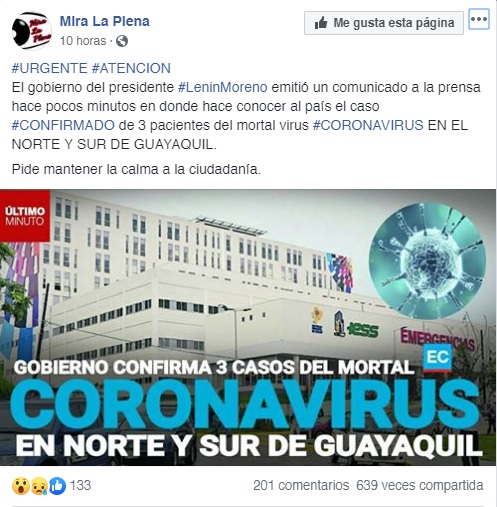 Otra mentira fue difundida la noche del 26 de enero en la página Mira La Plena. Este perfil afirmó que el Gobierno confirmó «3 casos del mortal coronavirus en norte y sur de Guayaquil». Para levantarlo se sirvieron de los logos y colores de Diario El Comercio, portal que no publicó una noticia relacionada. La mañana del 27 de enero el MSP desmintió este contenido.