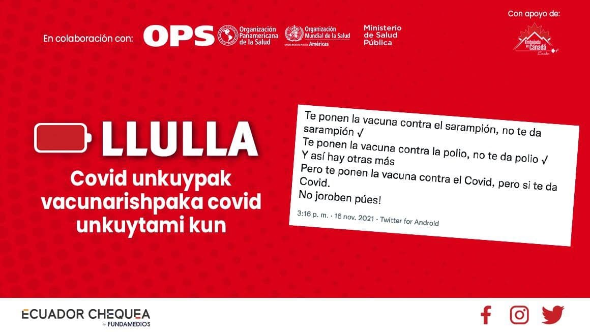 Twiiter pankapi nikun, sarampión unkuypak vacunarishpa, shinallatak polio unkuypa vacunarishpa mana chay unkuyta kunchu; shinapash covid-19 unkuypak vacunaka, covid-19 unkuyta kunmi. Chay willayka llullami kan.