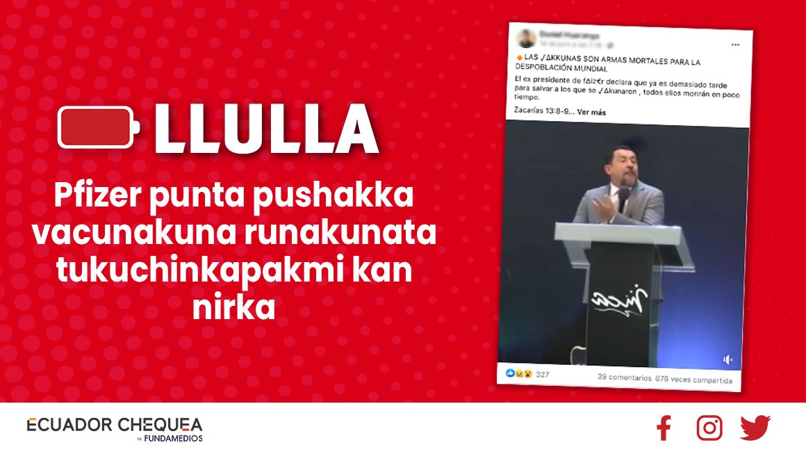Shuk kuyukshuyu redes socialespi purichinakun “Pfizer punta pushak”Mack Yaedon shutiwan paymi nin vacunakunaka tawka runakunaman wañuchinkami. “kallariy vacunata churashpaka 0.8% runakuna ishkay hunakaypi wañun”. Shinallatak ukkutapash wakllichinmi. Chaymantami runakunata wañuchinkapakmi kan.