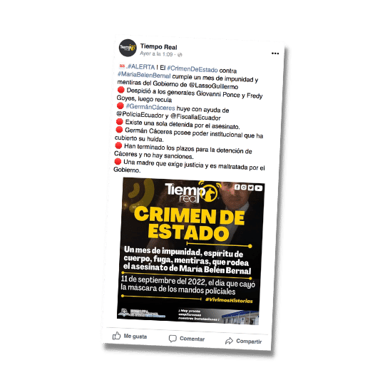 En la red social Facebook circula una imagen en la que se afirma expresamente que el caso de María Belén Bernal es un crimen de Estado. La información mencionada es engañosa. Las investigaciones en el caso de María Belén Bernal siguen avanzando. Aunque, entre los abogados hay un debate sobre si este caso podría determinarse o no como crimen de Estado, no hay un consenso, ni un fallo judicial. Por lo dicho, esa afirmación resulta una opinión, mas no un hecho fáctico.
