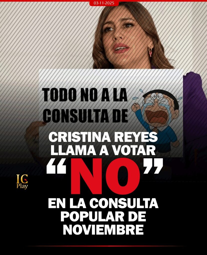 Una publicación en Facebook de la página IC Play afirma que Cristina Reyes llamó públicamente a votar por el NO en la consulta popular y referéndum convocados por el Gobierno. El post incluye una fotografía de la política junto a un cartel alusivo a esta postura.
