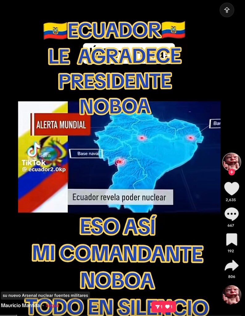 En TikTok circula un video en el que se muestra una supuesta “presentación de arsenal nuclear” atribuida al presidente Daniel Noboa. En el clip se insertan imágenes de misiles y equipamiento militar extranjero junto a subtítulos en español que aluden a una “presentación oficial”. El montaje imita el formato de un anuncio oficial, pero no corresponde a ningún acto real ni contiene marcas verificables de autenticidad.