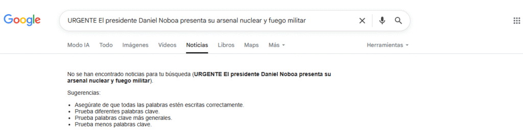 - Búsqueda avanzada de Google Noticias (noviembre 2025): sin resultados sobre “arsenal nuclear Ecuador”.