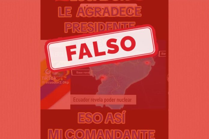 En TikTok circula un video en el que se muestra una supuesta “presentación de arsenal nuclear” atribuida al presidente Daniel Noboa. En el clip se insertan imágenes de misiles y equipamiento militar extranjero junto a subtítulos en español que aluden a una “presentación oficial”. El montaje imita el formato de un anuncio oficial, pero no corresponde a ningún acto real ni contiene marcas verificables de autenticidad.