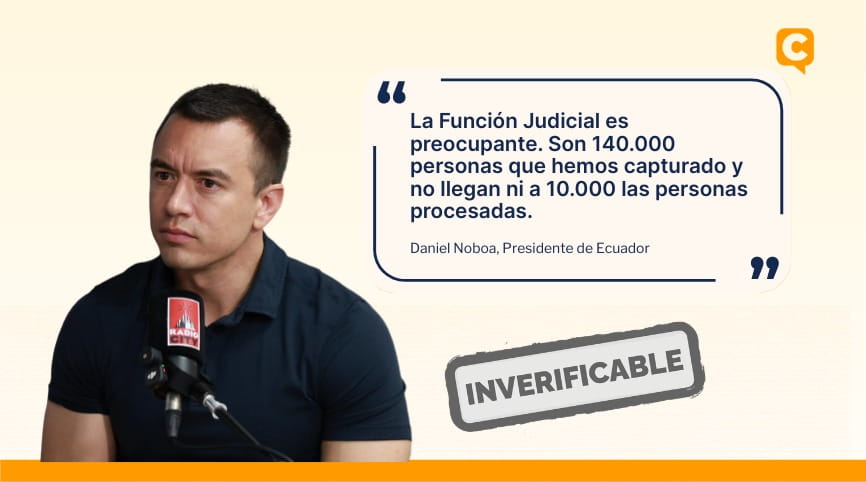 La afirmación del presidente Daniel Noboa sobre que “son 140.000 personas que hemos capturado y no llegan ni a 10.000 las personas procesadas” no puede ser verificada con la información pública disponible hasta el momento, es por eso que la calificamos como inverificable.