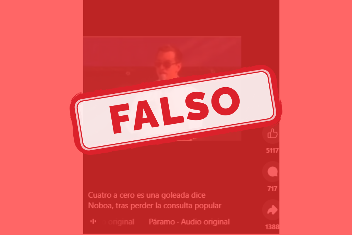 Un video viral en Facebook atribuye al presidente Daniel Noboa la frase: “cuatro a cero es una goleada”, después de la Consulta Popular de noviembre de 2025. La pieza utiliza un video manipulado con inteligencia artificial y recorta declaraciones reales de 2024 para simular un pronunciamiento reciente.