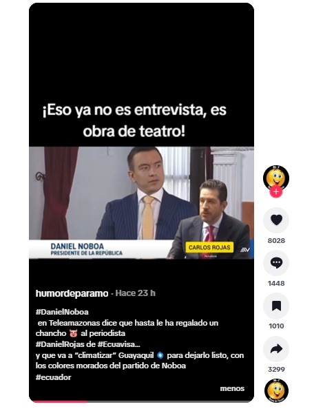 Circula en TikTok un video que muestra un fragmento de la entrevista concedida por el presidente Daniel Noboa a Teleamazonas el 31 de octubre de 2025. En el clip se escucha al mandatario mencionar que le dio un chancho al periodista Carlos Rojas.