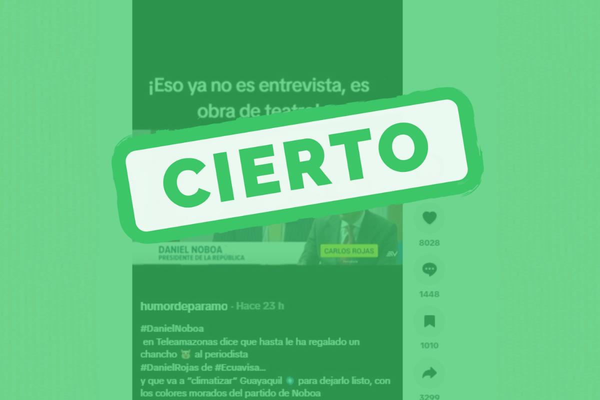 Es CIERTO. El presidente Daniel Noboa efectivamente dijo que le dio un chancho al periodista Carlos Rojas durante su entrevista con Teleamazonas, el 31 de octubre de 2025. El fragmento que circula en TikTok coincide textualmente con el registro audiovisual original. No hay evidencia de manipulación ni de descontextualización.