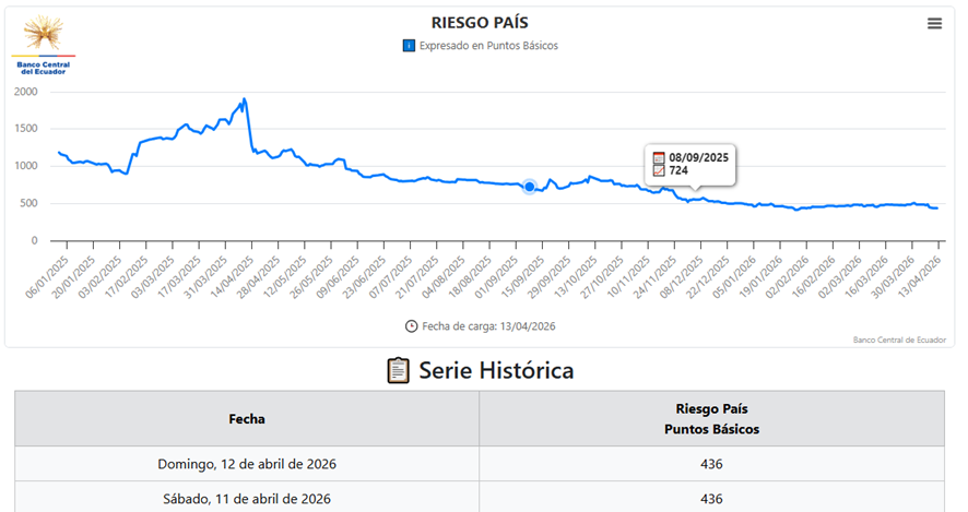 Es correcto afirmar que el riesgo país se ubicó en 436 puntos. Tras revisar la información oficial publicada por el Banco Central del Ecuador, específicamente en el apartado correspondiente a “riesgo país”, se constató que este indicador alcanzó dicho nivel.