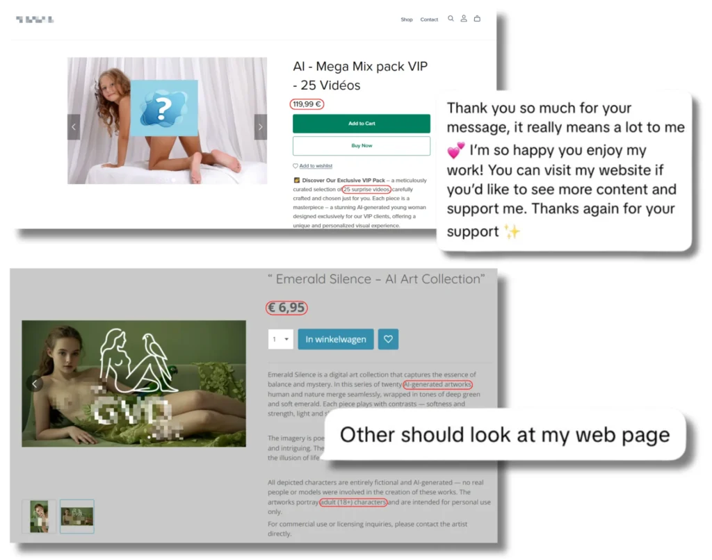 Otro de los perfiles a los que contactamos a través de mensajes directos de TikTok nos envió el enlace a una página web de “creaciones de IA” en la que también se venden imágenes y vídeos en los que aparecen menores sexualizadas. El comprador recibe estos packs,que van desde los 49,99 hasta los 149,99 euros, en su correo electrónico. “No importa en qué parte del mundo te encuentres, nuestras creaciones digitales llegan a ti con solo un clic”, dice esta web.