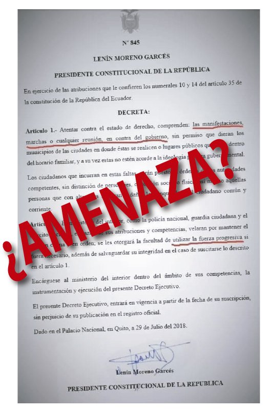 Este documento circuló a través de redes sociales desde el 4 de julio de 2018. En el mismo, el presidente Lenín Moreno autoriza a la Policía Nacional el uso progresivo de la fuerza en » las manifestaciones, marchas o cualquier reunión en contra del Gobierno». Este documento es falso.