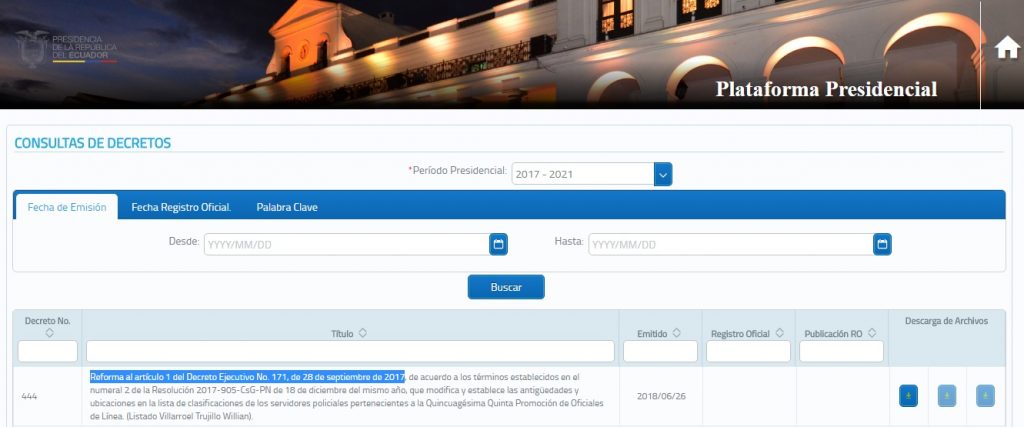 Este Decreto Ejecutivo sería el N° 845, de acuerdo al documento. Sin embargo, Moreno suscribió el último Decreto el 26 de junio de 2018 y este corresponde al N° 444, en el mismo se reforma al artículo 1 del Decreto Ejecutivo No. 171, de 28 de septiembre de 2017. Por tanto, el Presidente no ha firmado tal medida, según la información oficial de la Presidencia de la República.