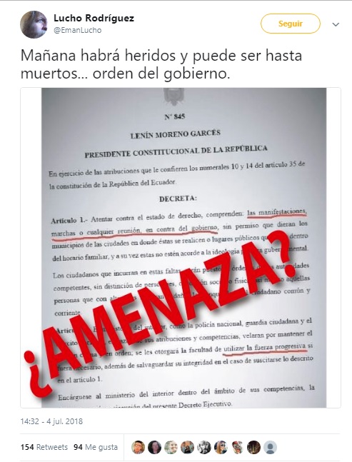 La publicación de esta información falsa coincide con la convocatoria de los militantes del partido Movimiento Acuerdo Nacional (MANA) a la marcha #IndignateEcuador. Dicha movilización se realizó este 5 de julio, desde las 15:00, en el parque El Arbolito, en Quito. La finalidad es respaldar al expresidente Rafael Correa, tras su vinculación en el caso de secuestro al exasambleísta Fernando Balda.