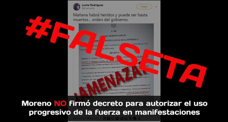 Este documento circuló a través de redes sociales desde el 4 de julio de 2018. En el mismo, el presidente Lenín Moreno autoriza a la Policía Nacional el uso progresivo de la fuerza en » las manifestaciones, marchas o cualquier reunión en contra del Gobierno». Este documento es falso.