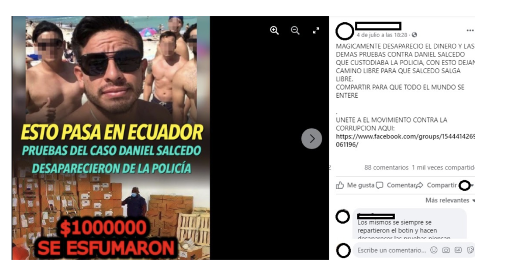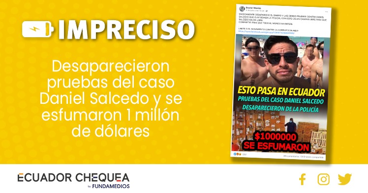 Desde 4 de julio, en cuentas de Facebook personales se difundió información sobre la desaparición de la sede policial, las pruebas del caso Daniel Salcedo y aseguran que USD 1 millón se esfumaron. La información es imprecisa, porque el 28 de junio de 2021, día del juicio por peculado contra Salcedo y otras 7 personas, se denunció la desaparición temporal de evidencia y no se perdió dinero en efectivo.