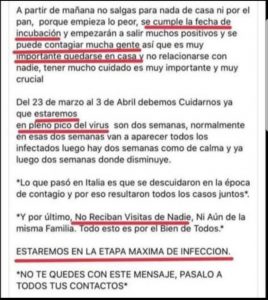 También explicó que otro error de ese texto es que habla de que el virus está en el pico máximo y no es así. “Lo correcto sería decir que la curva epidemiológica podría estar en un punto donde los contagios sean más frecuentes que antes, entonces la velocidad de contagio sería mayor y eso no tiene nada que ver con lo que dice allí”.