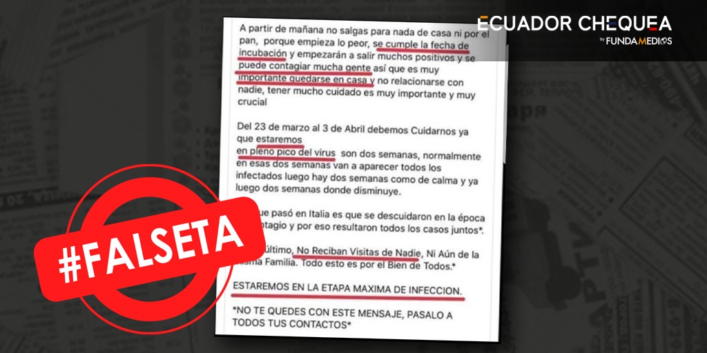 De la misma manera, el médico Esteban Ortiz explicó a Ecuador Chequea que el texto carece de toda lógica científica. “Este texto es totalmente falso porque en primer lugar el tiempo de incubación se da en cada una de las personas, no se da en el ambiente. El virus se incuba hoy en mi, mañana en mi mamá y pasado en mi abuela, entonces no hay tiempo de incubación porque es situación de cada persona, de cada organismo”, indicó.