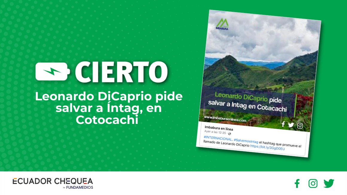 Desde la cuenta de Facebook del medio digital Imbabura en Línea se difundió desde el 31 de enero que Leonardo DiCaprio pide salvar a Íntag, en Cotocachi. La información es cierta.