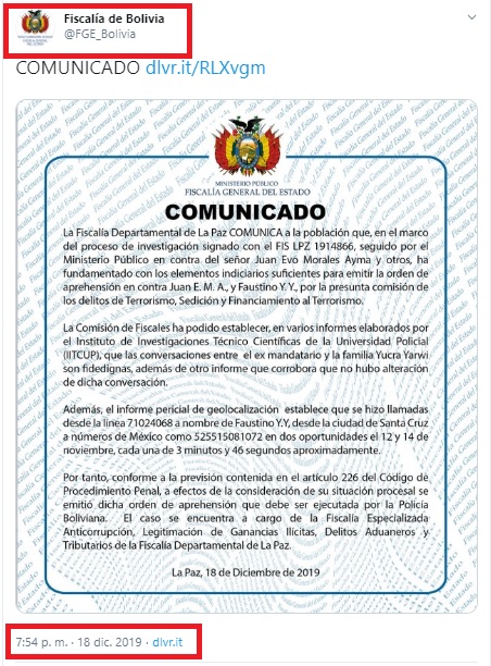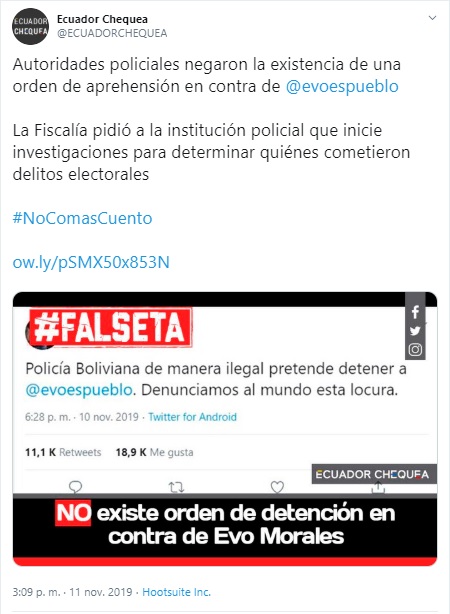 Un día después de la renuncia de Morales, en redes sociales circuló una supuesta orden de aprehensión contra el exlíder indígena, el mismo 11 de noviembre, fecha en que Morales viajó a México para asilarse.