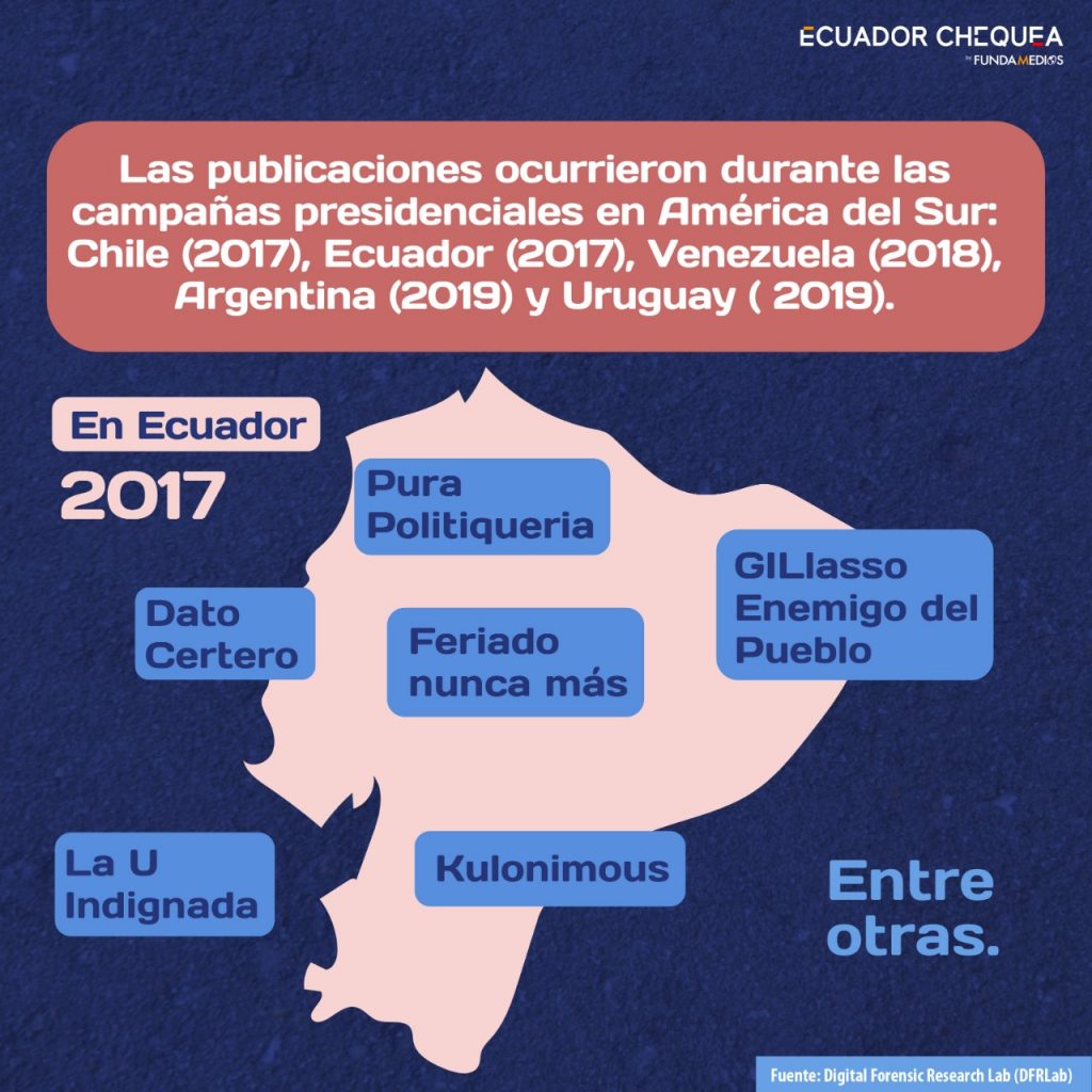 De acuerdo a DFRLab si se compara las fechas de creación y el contenido de las páginas, se evidencia que varios cuentas operaron casi exclusivamente durante las campañas presidenciales en América del Sur: Chile (2017), Ecuador (2017), Venezuela (2018), Argentina (2019) y Uruguay ( 2019).