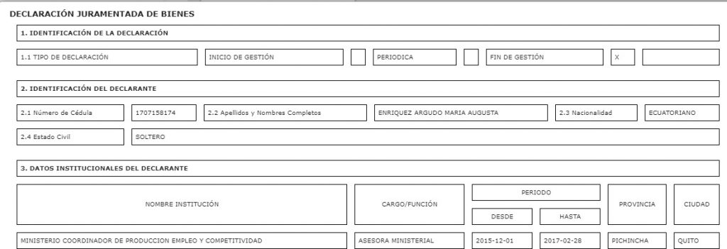 La Contraloría ubica a María Augusta Enríquez como asesora ministerial en el Ministerio Coordinador de Producción, Empleo y Competitividad en julio de 2016.