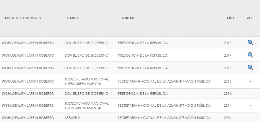 La coincidencia entre estos tres nombres es que cuando firmaron el acta de constitución eran funcionarios. De acuerdo con la Contraloría General del Estado, en julio de 2016 Roberto Wohlgemuth figura como Consejero del Gobierno en la Presidencia, ese mismo año también trabajó como Subsecretario Nacional Intergubernamental en la Secretaría Nacional de la Administración Pública: