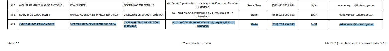 De acuerdo con la información del Ministerio de Turismo, en julio de 2016 Pablo Yánez ocupó el cargo de viceministro de gestión turística: