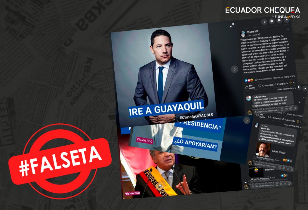 Después hubo otra mentira el 2 de mayo. Esa vez se afirmó que el periodista de CNN, Fernando del Rincón, visitaría Guayaquil, epicentro de la pandemia, “luego de recibir miles de correos electrónicos pidiendo auxilio por la muertes de miles de ecuatorianos”. Esta desinformación incluso detalló que el entrevistador de Conclusiones exigía que el Gobierno de Lenín Moreno dé las garantías de seguridad para que la libertad de expresión no sea violentada. Pero esto no ocurrió.