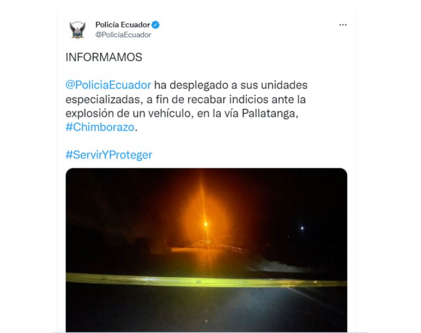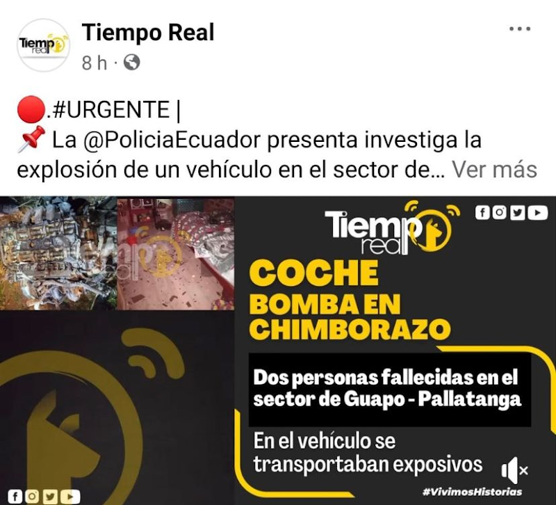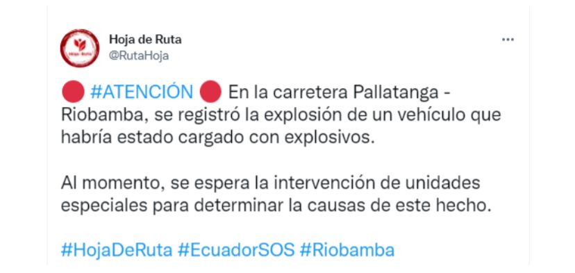 La explosión de un vehículo puso en alerta a los habitantes de Pallatanga, Chimborazo. El hecho se reportó alrededor de las 19:00 de ayer. Los moradores evidenciaron largas filas en la carretera E-487, en la vía a Pallatanga-Riobamba. Según medios locales, la explosión dejó dos personas fallecidas.