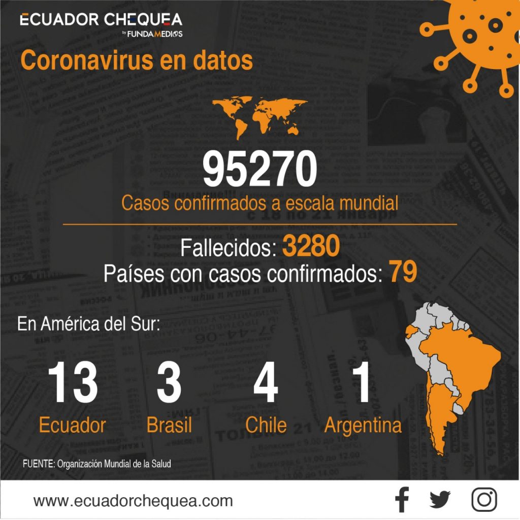 El contagio de Covid19 a escala mundial muestra la misma tendencia al crecimiento que en Ecuador. La Organización Mundial de la Salud (OMS) confirmó que al jueves 5 de marzo se registran 95.270 casos, con afectados en 79 países y 3.280 personas que murieron por esta causa. Sin embargo, el número de recuperados asciende a 53.638.