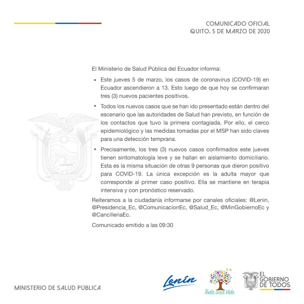 Los tres pacientes nuevos estaban dentro del cerco epidemiológico desarrollado desde la primera detección, confirmada el pasado 29 de febrero en Ecuador. Se trata de una señora de 71 años que ingresó al aeropuerto José Joaquín de Olmedo, en Guayaquil, procedente de Madrid (España).