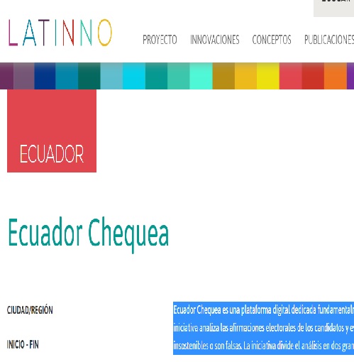 Ecuador Chequea es una plataforma digital dedicada fundamentalmente a la verificación de discursos electorales. Esta iniciativa analiza las afirmaciones electorales de los candidatos y evalúa si son ciertas, merecen contextualización, son insostenibles o son falsas. La iniciativa divide el análisis en dos grandes campos: economía y política. A su vez, cuenta con diversas secciones entre las que se destacan el Palabrómetro, Conocé a Tu Candidato, Planes de Gobierno y la Voz de la Academia. Quienes impulsan la iniciativa se asumen como una experiencia colaborativa entre la sociedad civil, la academia y el periodismo, en tanto su trabajo concentra actividades de docentes y analistas de al menos 10 organizaciones, entre universidades, observatorios de política pública y demás tanques pensantes. Asimismo, utilizan herramientas del fact checking, dentro de las tendencias que emergen en entornos digitales a fin de confrontar datos. Ecuador Chequea se inscribe, además, en un movimiento de verificadores de datos -fact checkers- con al menos 100 experiencias globales activas.