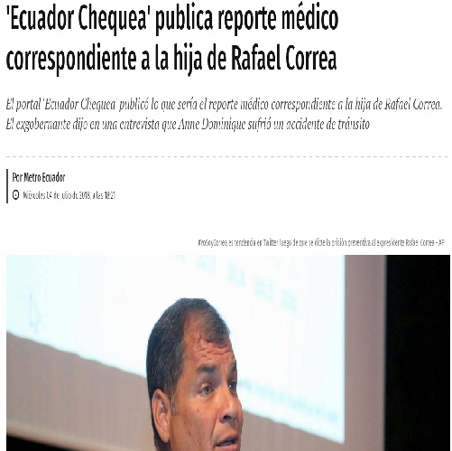 ‘Ecuador Chequea’ publicó lo que sería el reporte médico correspondiente a la hija de Rafael Correa, expresidente ecuatoriano. Él dijo en una entrevista a un diario español que no se presentaría a la audiencia judicial porque su hija «sufrió un accidente de tránsito grave».