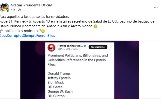 Otro ejemplo de desinformación es la publicación que circula en Facebook, que afirma que Robert F. Kennedy Jr. aparece “puesto 13” en una supuesta lista de los “Epstein files” y que, además, es padrino de bautizo de Daniel Noboa y “compadre” de Anabela Azín y Álvaro Noboa.