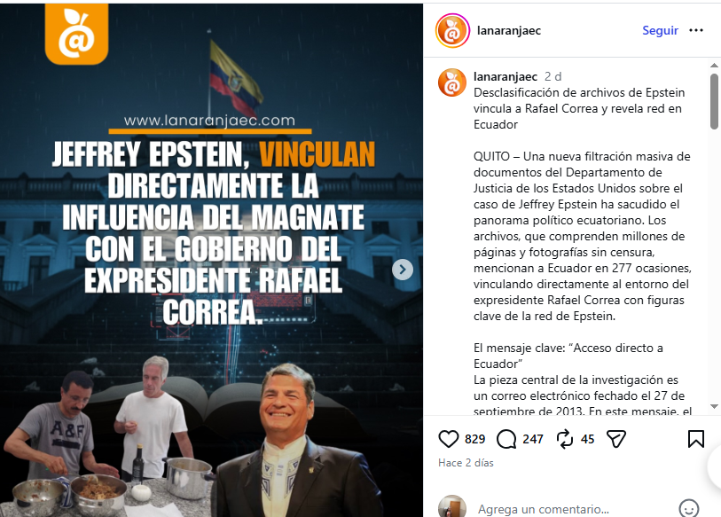 Un post en Instagram que asegura que una “desclasificación” de archivos del caso Jeffrey Epstein “vincula directamente” la influencia del magnate con el gobierno del expresidente Rafael Correa y “revela una red en Ecuador”.
