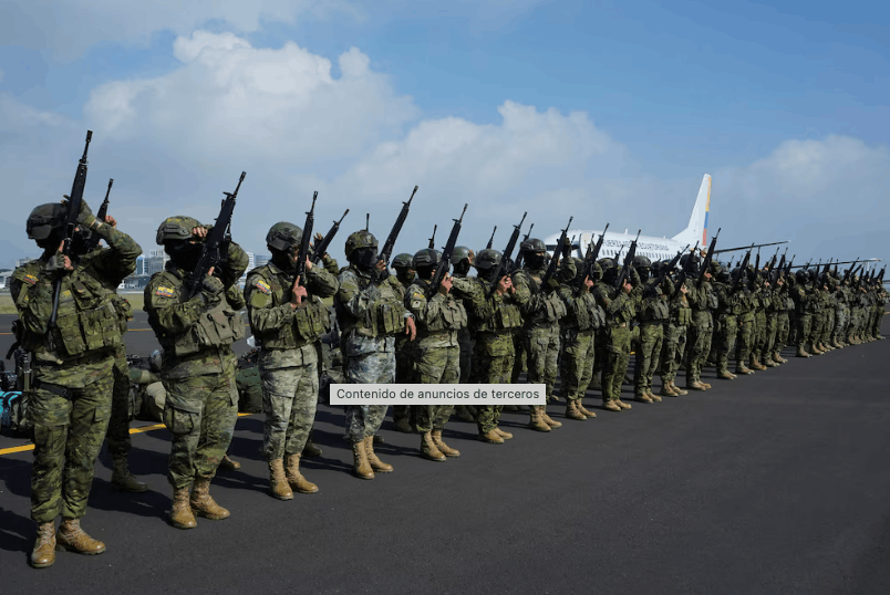 Soldados ecuatorianos llegan a la Base Aérea Simón Bolívar para ser desplegados estratégicamente en las provincias de Guayas, Manabí y Los Ríos, mientras el gobierno intensifica las operaciones militares en su lucha contra los grupos criminales violentos, en Guayaquil, Ecuador, 16 de enero de 2026. REUTERS/Cesar Munoz
