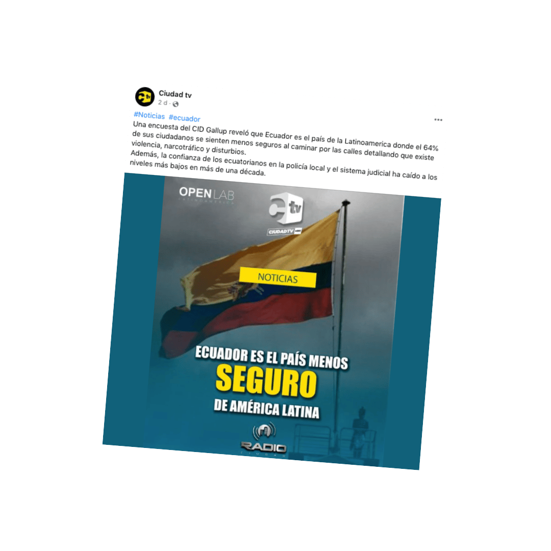 En una publicación de Facebook se dice que Ecuador se ha convertido en el país menos seguro de América Latina. En la descripción del post se afirma que el 64% de los ecuatorianos no se siente seguro al caminar por la noche, según una encuesta publicada por Gallup. La información es engañosa. El estudio al que hace referencia existe, pero mide la percepción de la inseguridad, no se miden datos o estadísticas para determinar la inseguridad.