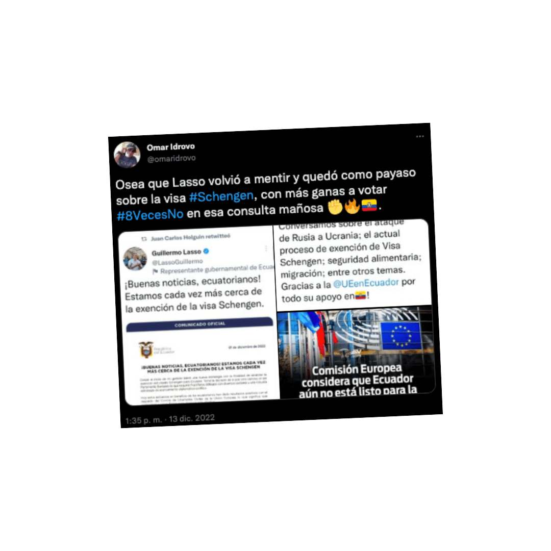 Ecuador se aferra a la exención de visas para entrar libremente al espacio europeo. En una publicación en redes sociales se asegura que el presidente, Guillermo Lasso, mintió respecto a la exención de visados Schengen para ecuatorianos. La información es falsa. El proceso que esperaba Ecuador para alcanzar este objetivo se vio afectado por un escándalo de corrupción que involucra al Parlamento Europeo y a Catar, uno de los países que se encontraba en el paquete de naciones que solicitaron la exención. Sin embargo, hoy, el Gobierno ecuatoriano anunció que este proceso sigue en marcha.