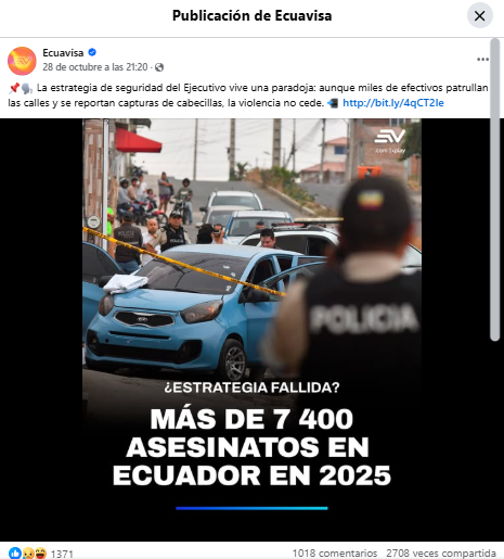 Un usuario en X citó a Ecuavisa sobre más de 7.400 asesinatos en 2025. La publicación del medio existe y corresponde a un post del 28 de octubre de 2025.