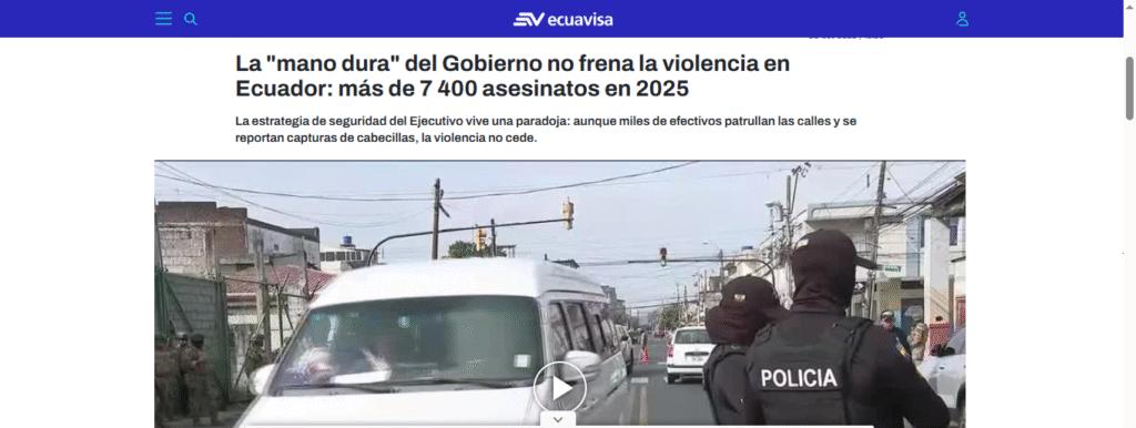 - Ecuador acumula 7.439 muertes violentas en lo que va de 2025, superando las cifras de años anteriores pese a la estrategia de “mano dura” del Gobierno de Daniel Noboa.