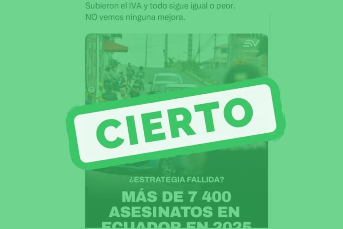 Circula en X un post donde se asegura que Ecuavisa publicó que en Ecuador hubo más de 7.400 asesinatos en 2025. La publicación incluye una captura atribuida a la cuenta oficial de Ecuavisa.