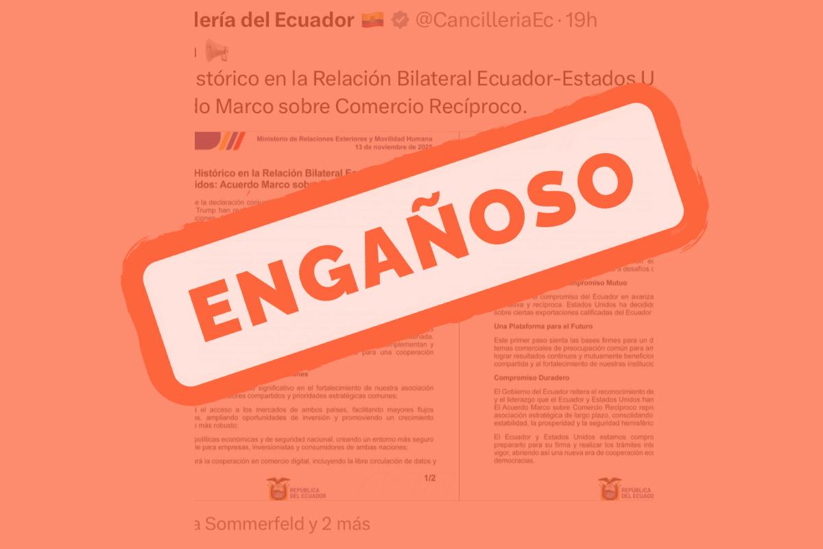 La Cancillería del Ecuador aseguró que EE. UU. eliminó aranceles para ciertas exportaciones que cumplan requisitos. Sin embargo, el comunicado oficial de la Casa Blanca y la hoja informativa del USTR confirman que solo existe un acuerdo marco aún pendiente de cierre, firma y procedimientos internos. La eliminación de la sobretasa del 15% no está vigente.
