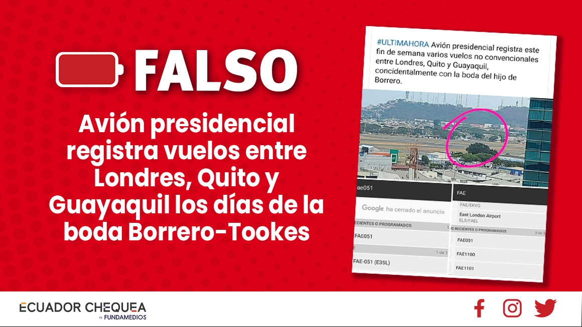En cuentas de Facebook personales circuló una foto de la pista del aeropuerto de Guayaquil con un avión en pista y se aseguró que se trataba del avión presidencial que hacía viajes entre Londres, Quito y Guayaquil para transportar a personas que acudieron a la boda del hijo del vicepresidente ecuatoriano, Juan David Borrero y la top model Jasmine Tooke, que se realizó en Quito. La información es falsa.