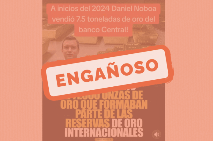 La publicación difundida en redes muestra una fotografía del presidente Daniel Noboa con el texto sobreimpreso: “A inicios del 2024 Daniel Noboa vendió 7.5 toneladas de oro del Banco Central”. El mensaje se replica en TikTok, Facebook y X, acompañado de frases críticas sobre una supuesta “venta del oro nacional”, sin citar documentos oficiales ni fuentes verificables.